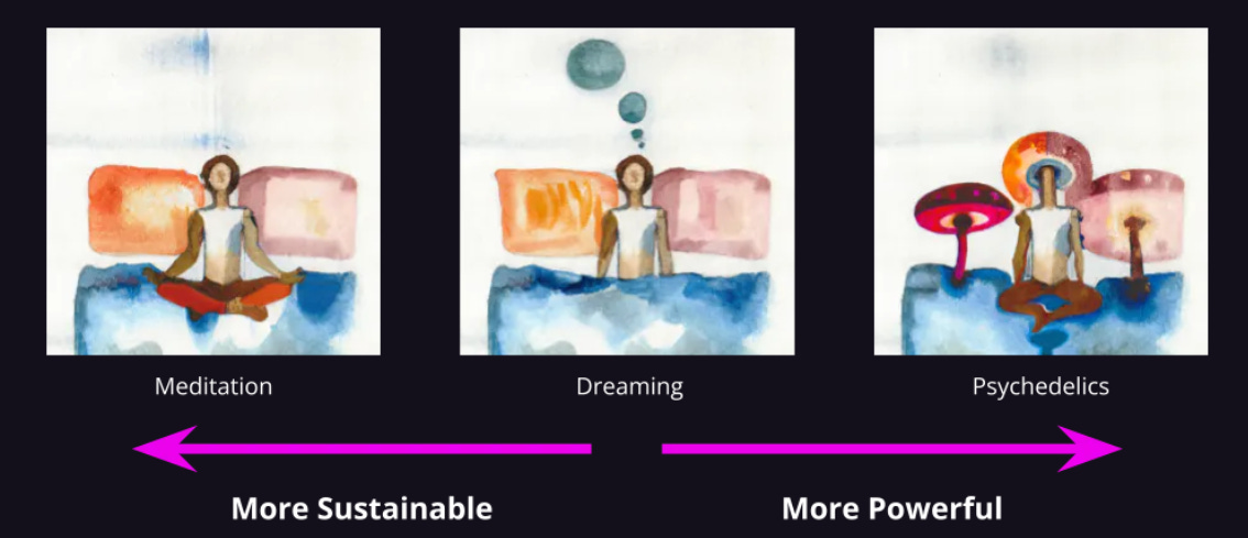 These articles address common limiting factors such as dream recall as well as a practical approach to lucid dreaming (which if stabilised, creates the potential to ask for guidance directly within the dream state). Superb Owl also discusses how Active Dreaming is a modality which lies naturally between meditation and the therapeutic use of psychedelics, which is accompanied by this awesome graphic: