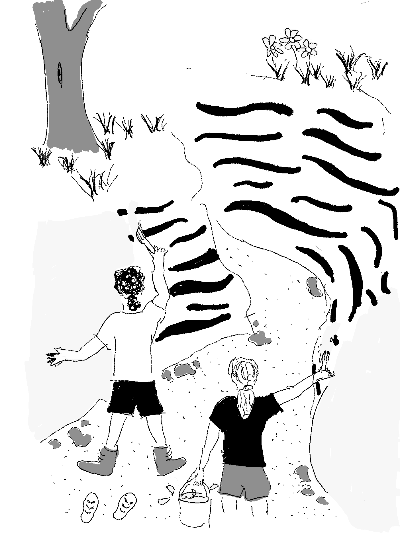 I am on a hike with a friend through a beautiful narrow gorge. The cliffs of the gorge are black and white in colour. As we walk through, we are painting over the black and white in a neutral tone.