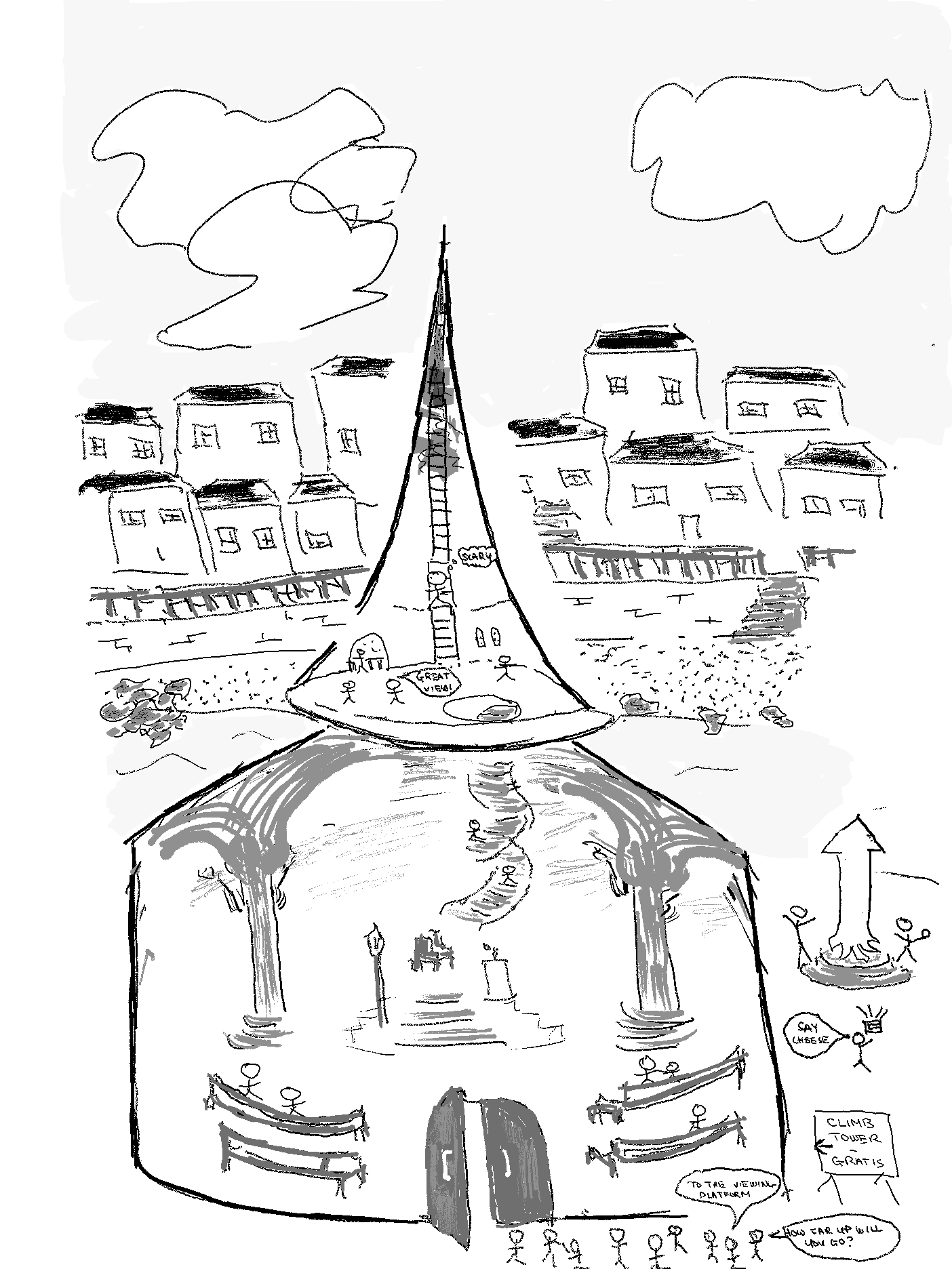 While sightseeing, I come across a Church which has opened its doors to tourists wanting to climb its staircase for good views of the city. The roof of the Church is a cusp (the dream is interlaced with my PhD supervisor drawing the cusp of a hyperbolic manifold for me in his office). I decide I will only go part of the way up to the first viewing platform, because I realise that after that the climb will become too suffocating.